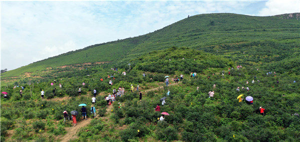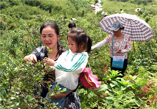 6月9日,安徽合肥、铜陵等地2000多名游客来此参加绿色采摘活动,尽情享受采摘蓝莓的快乐。