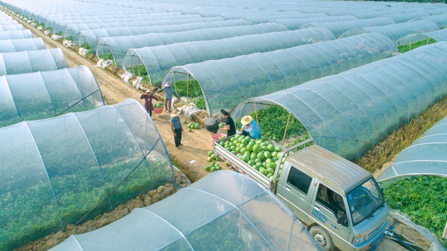 图为东流镇红叶村农业产业示范示区扶贫生产基地麒麟西瓜喜获丰收