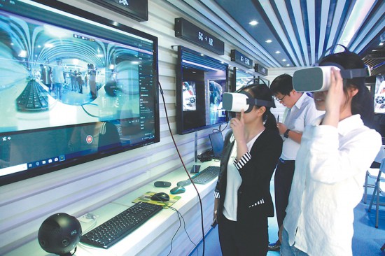 近日,安徽“智慧政企”大篷车巡展走进繁昌,展示中国移动5G网络建设在云计算、大数据、物联网、智慧城市等新兴领域的成功实践和应用成果。图为来自繁昌县中小企业的工作人员正在体验5G技术。通讯员 杨华 摄