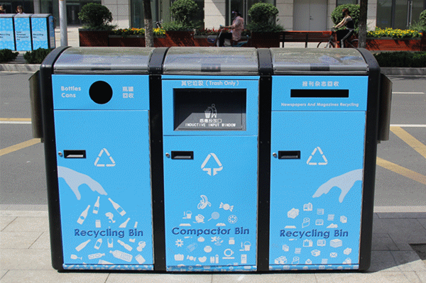 这种智能分类垃圾箱配备了三块40W太阳能电池板,每天可发电0.72度电,主要用于感应开盖投放垃圾和对垃圾的自动压缩处理,不仅大大降低了对垃圾箱的收集频率,同时也减少了垃圾运载次数和碳排放的数量。