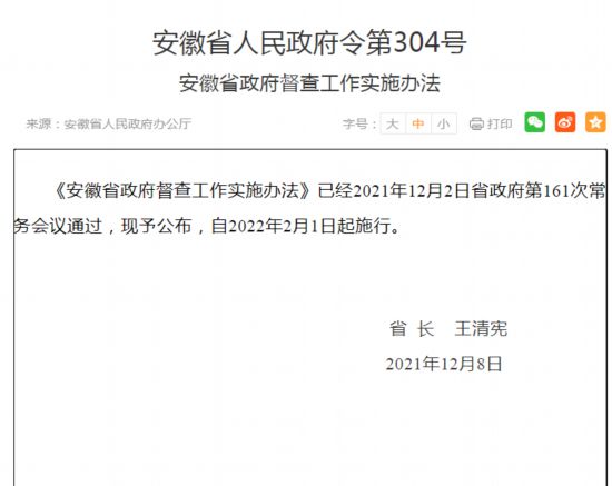 近日,《安徽省政府督查工作实施办法》公布,自2022年2月1日起施行。