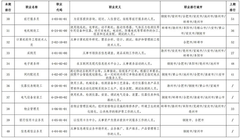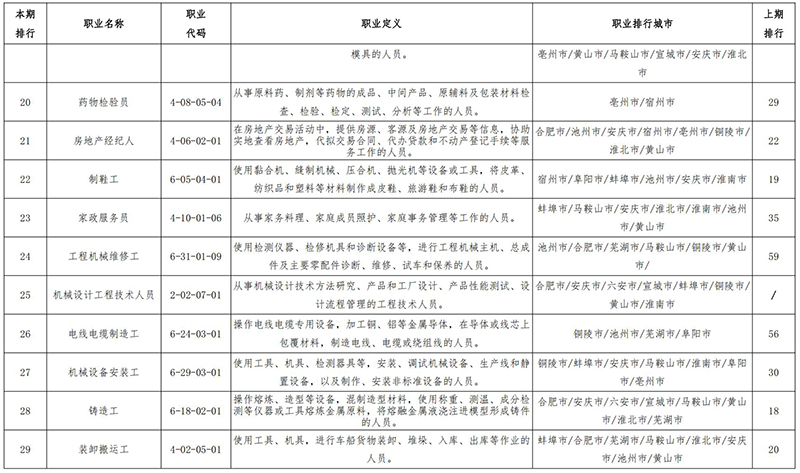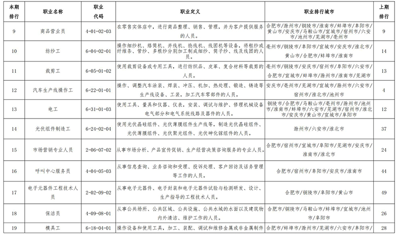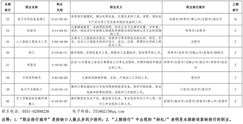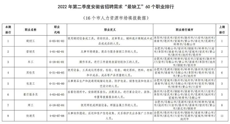 7月27日,安徽省人力资源和社会保障厅网站公布“2022年第二季度安徽省招聘大于求职‘最缺工’的60个职业排行”,数据来源于全省16个市200家定点监测人力资源市场招聘求职职业数据。