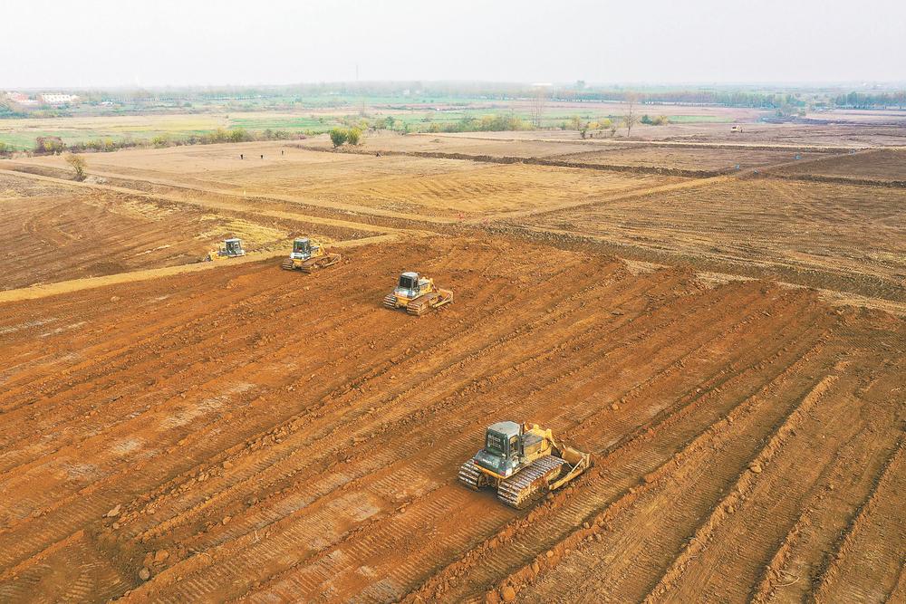 日前,五河县朱顶镇井头村高标准农田项目建设现场,推土机、铲车等各种大型机械往来作业。进入冬季,该县开展高标准农田建设,计划建设高标准农田14万亩,为确保粮食生产安全打下坚实基础。通讯员 李向前 摄
