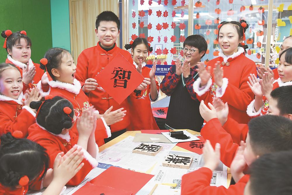 2月6日,合肥师范附小的学生在开学典礼上手持拓印的汉字,共同分享文字之美。(记者 程兆 摄)