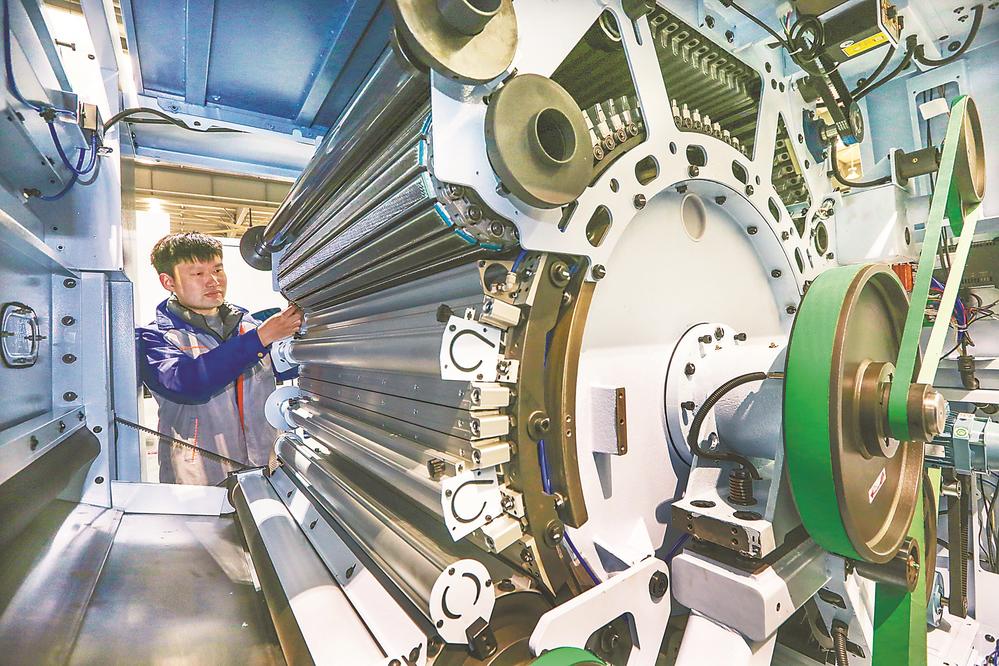 日前,安徽马鞍山经开区日发纺织机械有限公司的工人在组装出口到“一带一路”沿线国家的智能纺机。近年来,该公司开发出多条智能纺织机生产线,着力打造世界智能纺织装备产业基地,产销两旺。 特约摄影 王文生 通讯员 吴克刚 摄