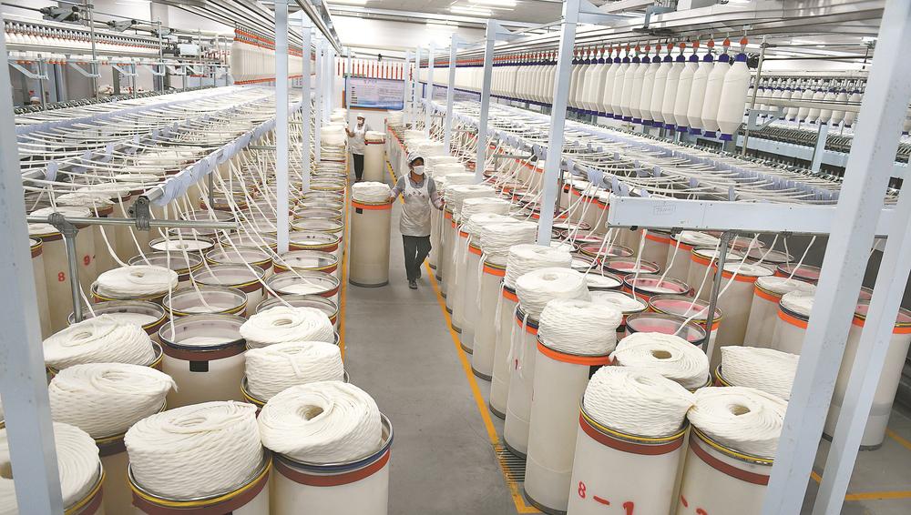 日前,在安庆宿松经济开发区一家高智能混纺纱生产线上,工人们在加紧生产棉纱制品。该公司产品畅销长三角、珠三角等地区。通讯员 黄有安 刘修远 摄