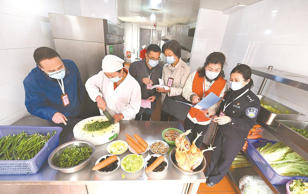 3月16日,在安庆市迎江区孝肃路街道荷花塘社区,人大代表、政协委员、居民代表等正对养老助餐点开展全过程监督检查,让老年人吃上“放心餐”。通讯员 黄有安 陈 美 摄