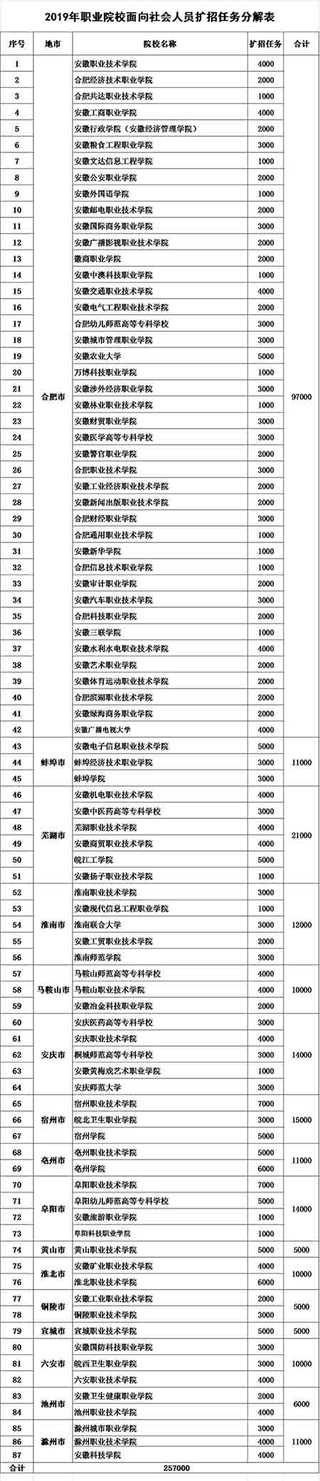 5月20日,记者从安徽省教育厅获悉,为进一步改革完善安徽省高职招生制度,省内87所高职院校将面向社会人员(退役军人、下岗职工、农民工、新型职业农民等)扩大招生共计257000名。