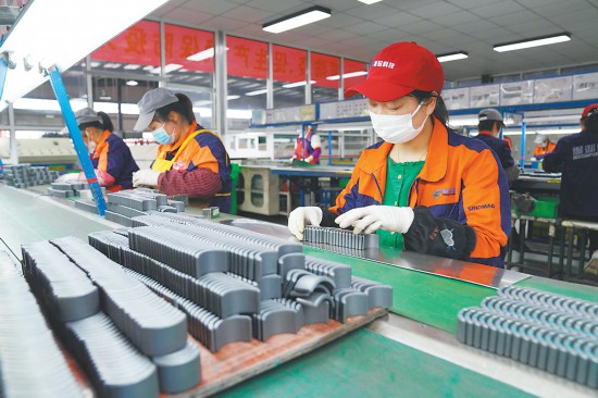 4月15日,在庐江县安徽龙磁科技股份有限公司内,复工复产的“扶贫车间”40多名工人正在赶制销往东南亚及欧美等国的永磁铁氧体磁瓦产品。 通讯员 周跃东 摄
