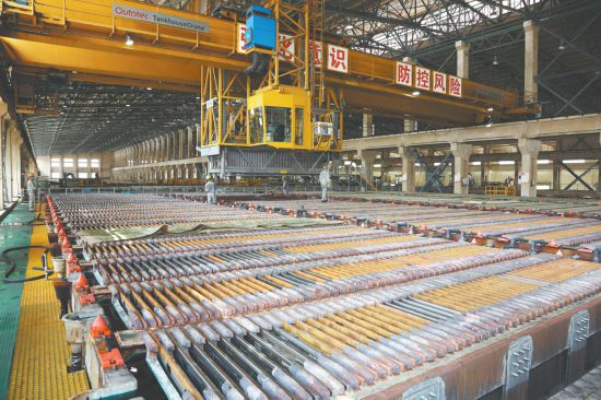 4月8日,在铜陵有色金属集团股份有限公司金冠铜业分公司的双闪电解车间,车间工人正在电解铜槽面配合行车设备进行电解铜装出槽作业。 通讯员 潘伟 摄