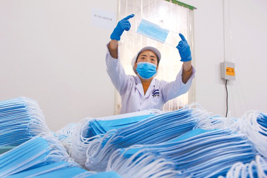 4月17日,位于淮北市相山区凤凰山经济开发区的安徽澳瑞口罩厂生产车间,工人在仔细检查订单口罩质量。自复工以来,企业满工满产,抢工抢时,口罩日产量达30万只,每周外贸订单需求量达100余万只。 通讯员 周方玲 摄