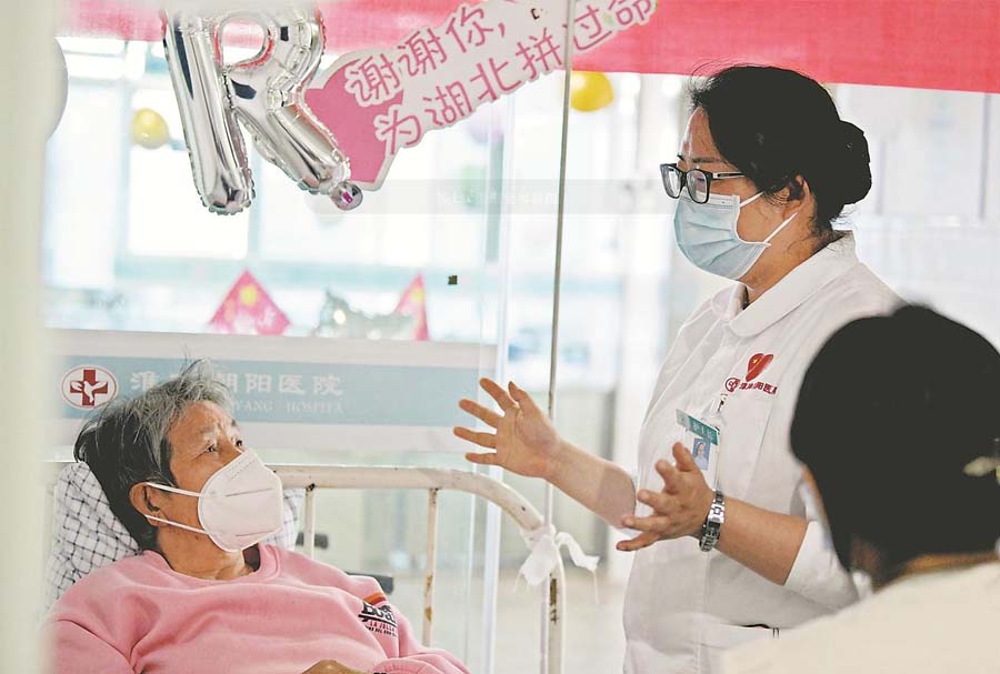 5月6日,淮南市朝阳医院心脏中心CCU护士长杨睿在与患者交流。杨睿是我省第一批援鄂、最后一批返回的医疗队队员,70多天里,转战武汉协和东西湖区人民医院和武汉市肺科医院。她于3月1日火线入党,成为一名预备党员。 特约摄影 陈彬