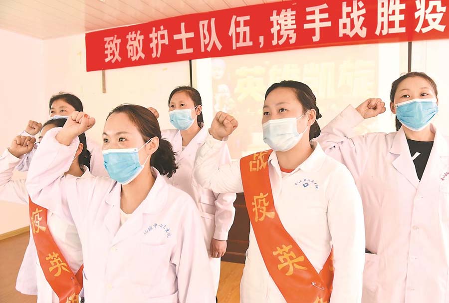 5月10日,含山县人民医院援鄂医护人员黄成凤、戴玲玲(右二)与仙踪中心卫生院医护人员分享武汉一线抗疫经历,重温南丁格尔誓言,携手共迎国际护士节。 通讯员 欧宗涛 邵家存 摄