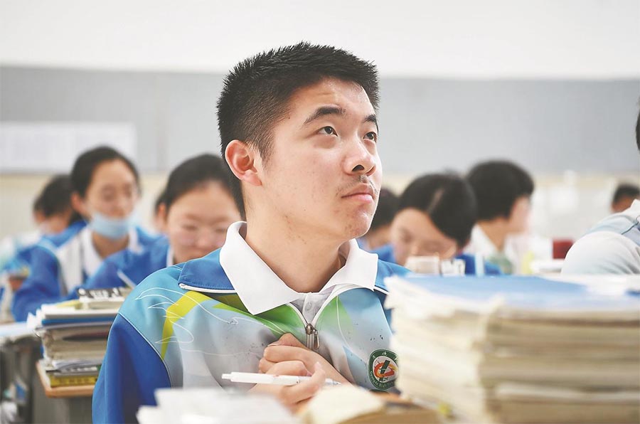 5月28日,在广德中学高三(19)班课堂上,程东东认真听讲。