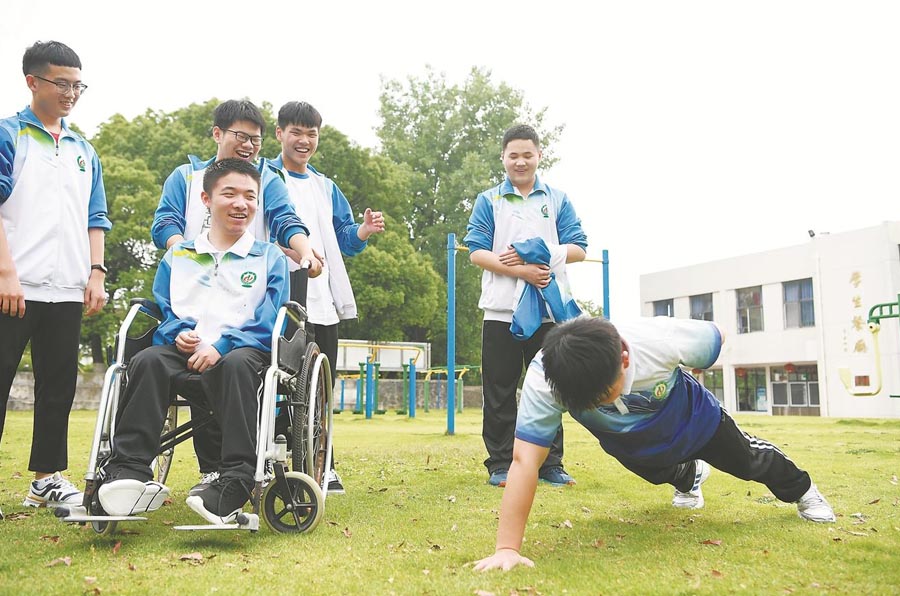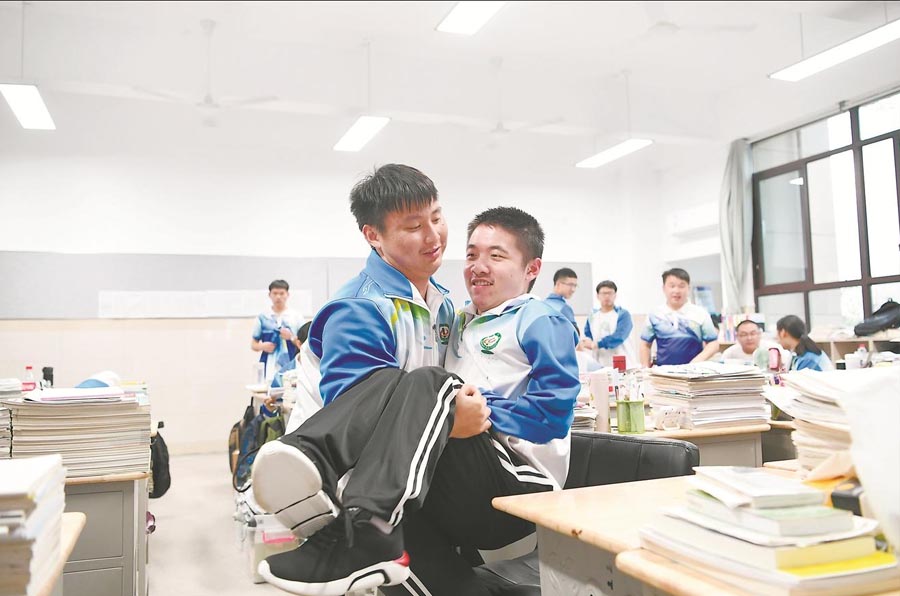 “叮铃——叮铃——”5月28日17时45分,下课铃响起后,广德中学高三(19)班的学生迅速离开教室前往食堂,程东东妈妈刘香则准时来到他的课桌旁,送上晚饭。距离高考仅剩一个多月时间,课程十分紧张,程东东每天大部分时间都在课桌前度过。二十分钟后,帮扶小组的同学陆续返回,搬来轮椅,抱起东东放上轮椅,有说有笑推向操场。健身器材旁,同学们唱歌、跳舞、做健身活动,换着法子逗东东开心,一起享受着短暂的休息时间。