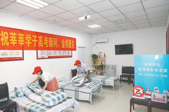 7月4日,合肥市蜀山区金荷社区党群服务中心的工作人员将会议室改造成高考休息室,为离家较远的考生和家长提供一个良好的午休环境。记者 范柏文 摄