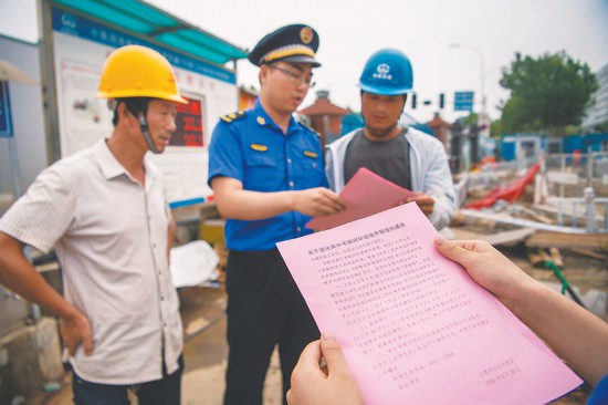 7月4日,合肥市包河区常青街道城管执法人员在合肥轨道5号线祁门路站工地抽检噪音值,确保高考、中考生有一个安静的考试环境。记者 李博 摄