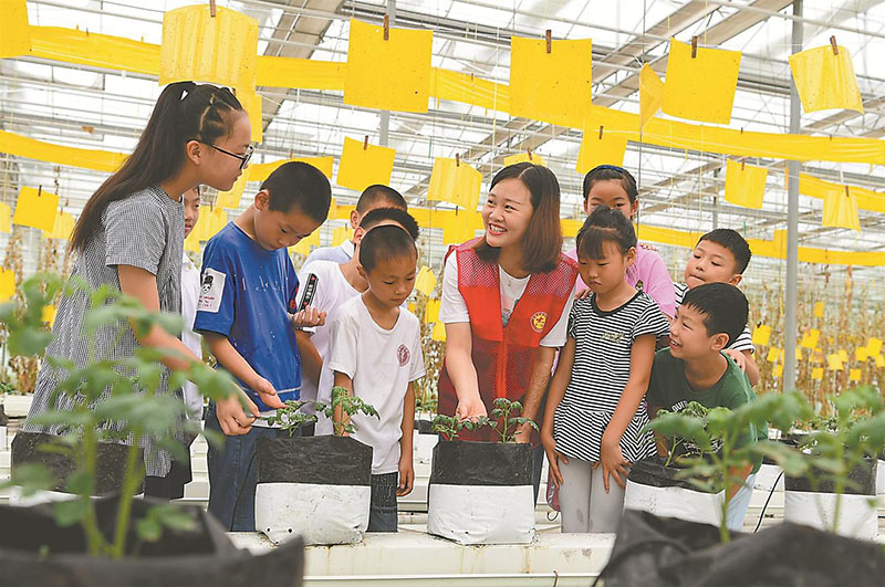 8月9日,肥西县新时代文明实践中心联合花岗镇新时代文明实践所举办“情牵留守儿童”暑期实践活动。在志愿者带领下,该镇留守儿童来到肥西现代农业示范园区了解有机蔬菜的播种、育苗、栽培过程,感受科技农业带来的魅力。(记者 姚林 通讯员 马家贵 摄)