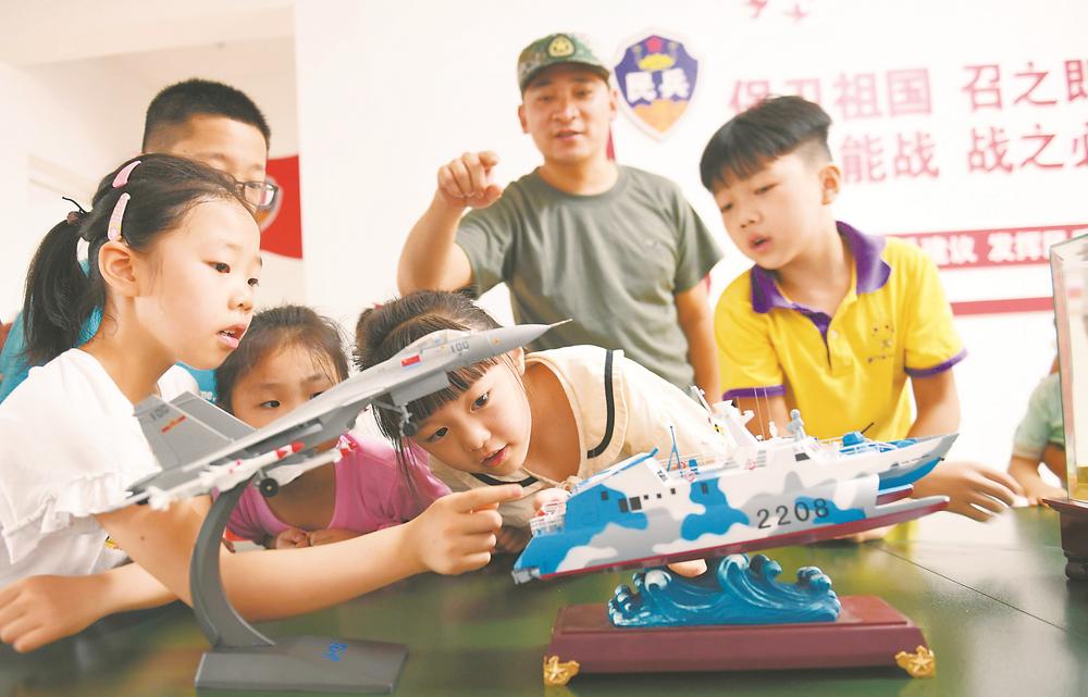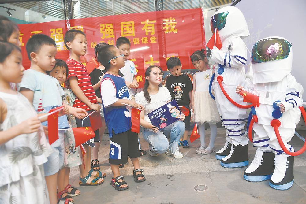 7月19日,合肥市家家景园天玥中心创业街内,小朋友们在老师的带领下参加航天科普暑期活动。孩子们身着手工制作的航天服,观看航天模型,了解航天知识。 记者 杨竹 通讯员 朱茜 摄