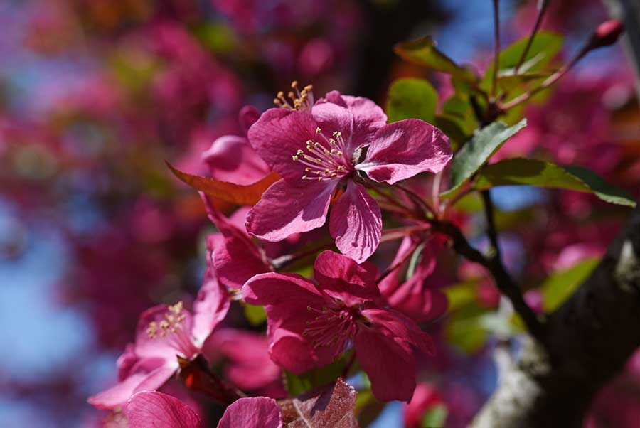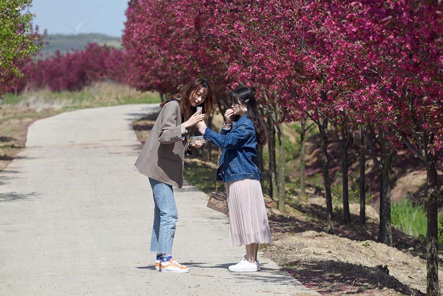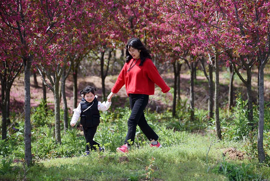 清明小长假期间,安徽省来安县施官镇贾龙村4千余亩海棠花竞相绽放,汇成一片红色的海洋。