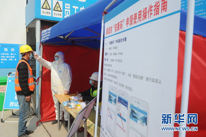 3月4日,安徽省阜阳市,建筑工人进工地前先测量体温。